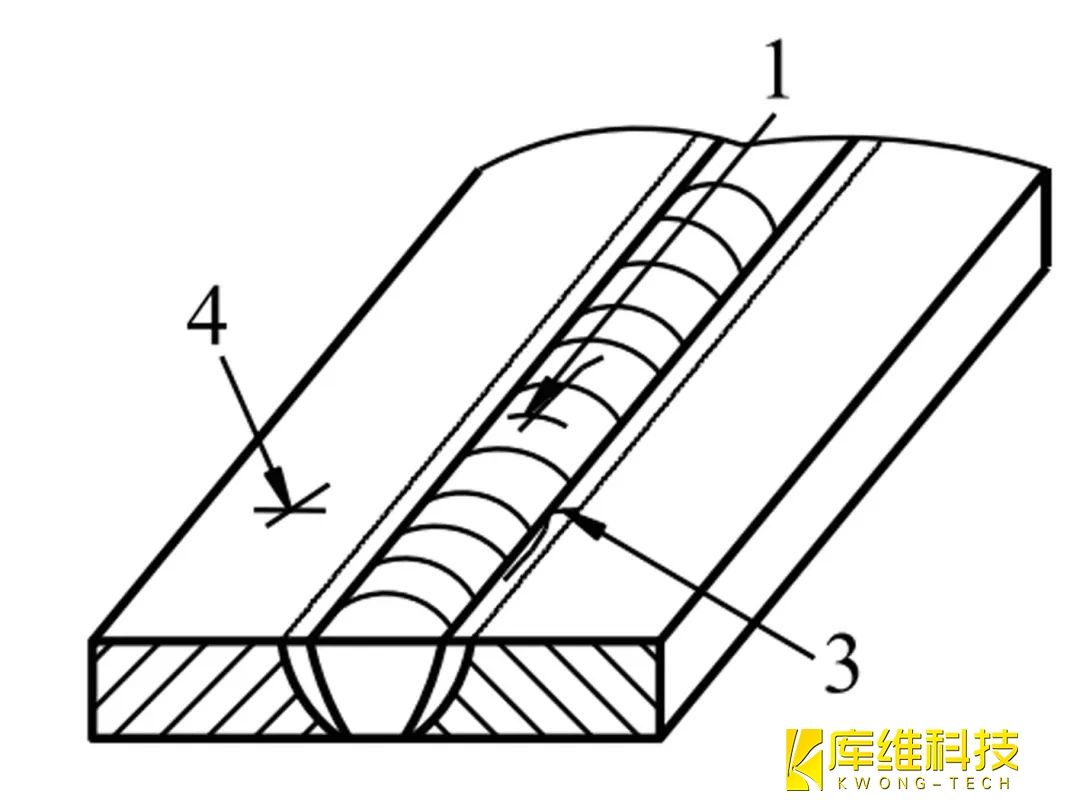 基本上與焊縫軸線平行的裂紋,可能存在于焊縫金屬中(1)、熔合線上(2)、熱影響區(qū)(3)以及母材金屬中(4)。